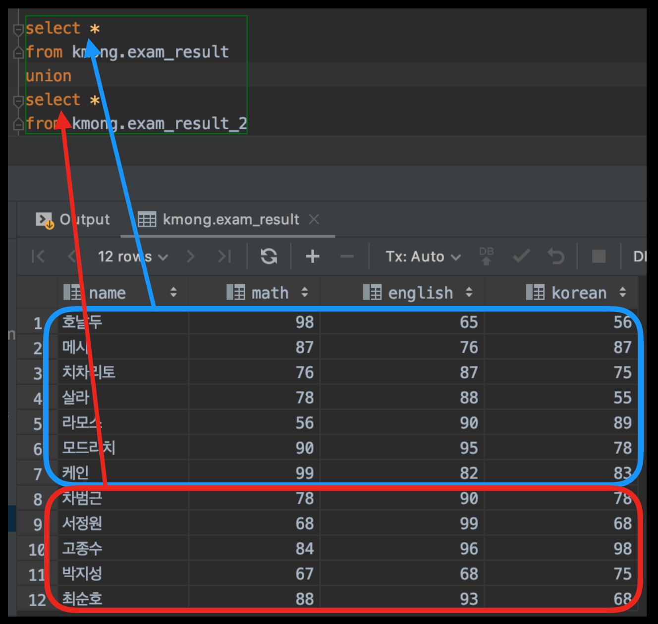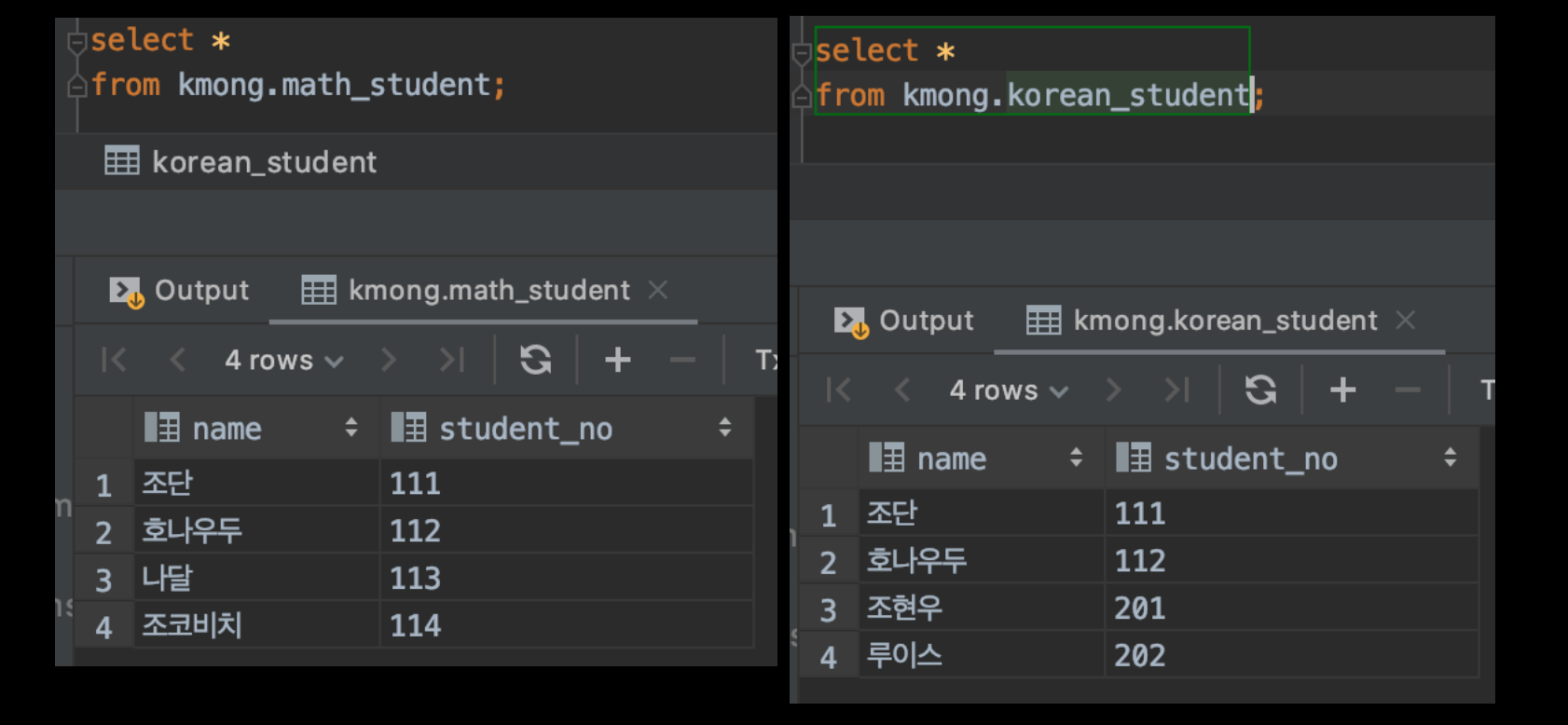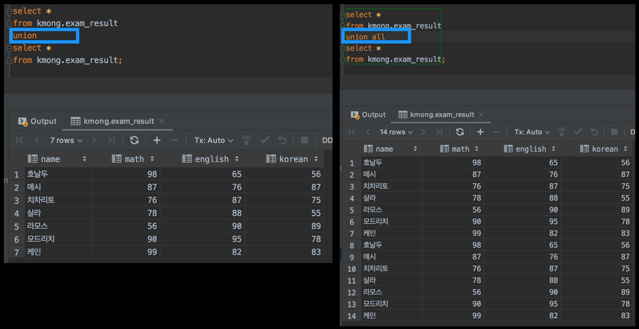 같은 테이블을 UNION , UNION ALL로 각각 합쳐봤습니다. 중복을 제거하는 UNION에서와 제거하지 않는 UNION ALL의 차이점이 한눈에 보입니다.
