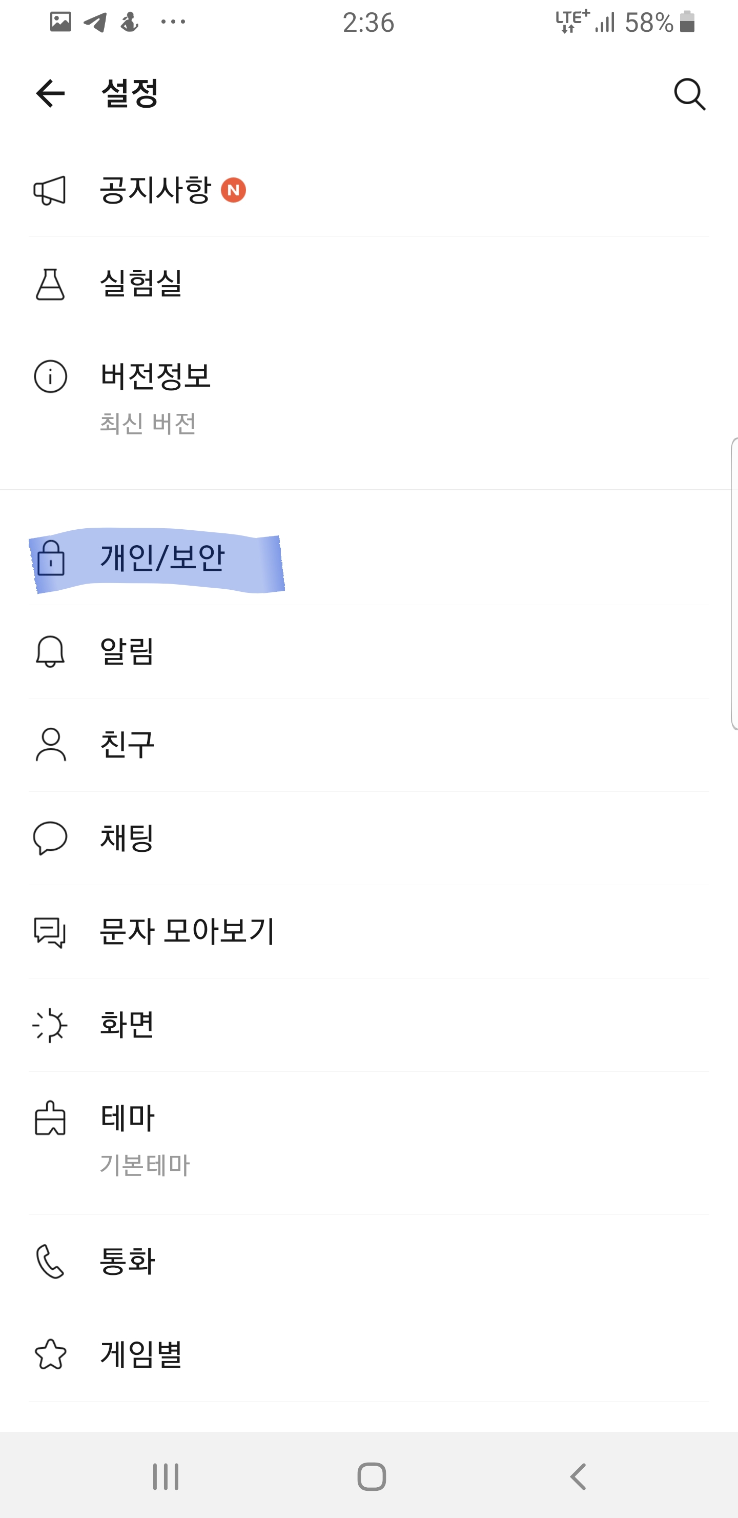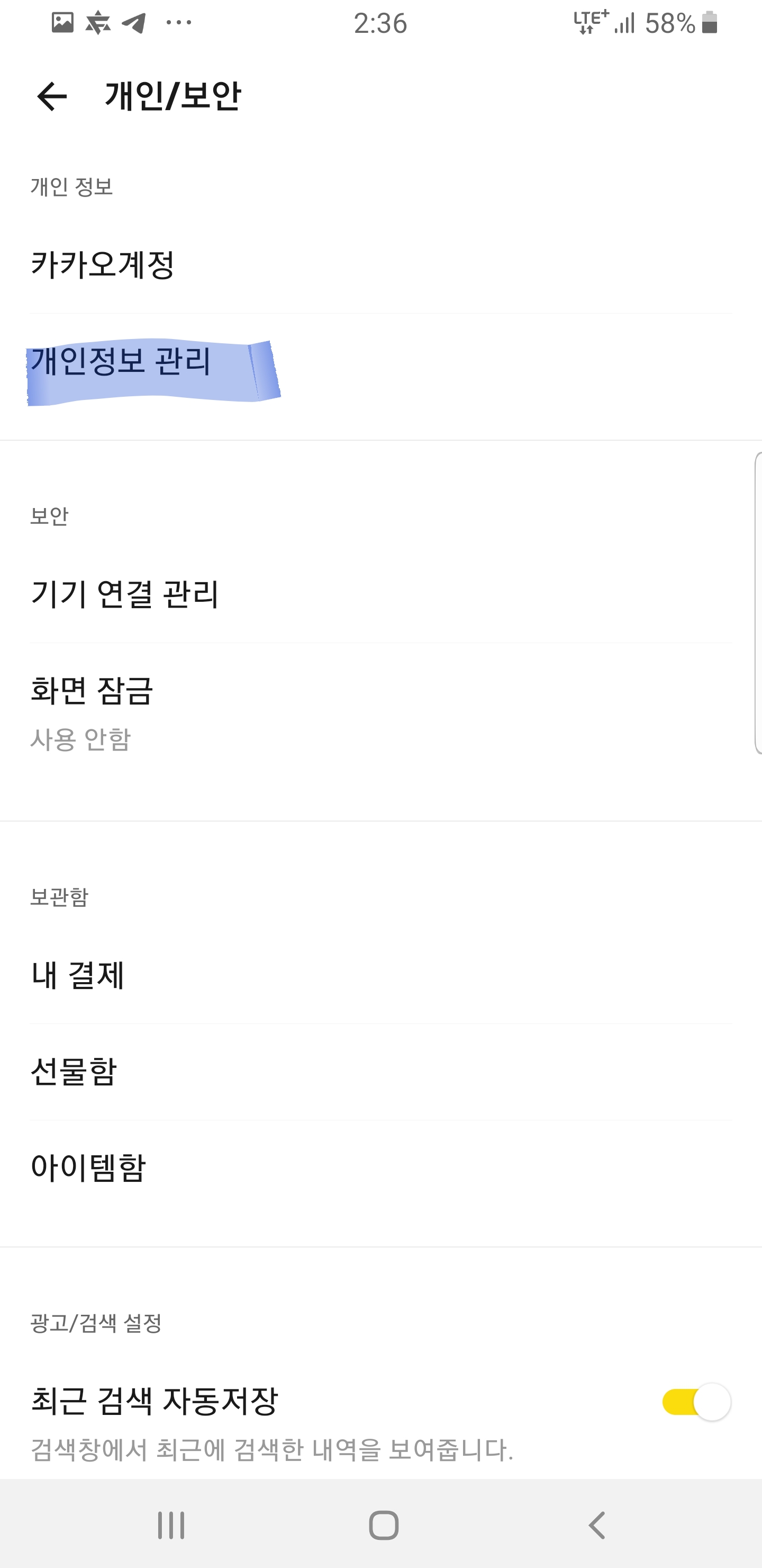 설정화면에서 개인/보안 버튼을 클릭합니다.