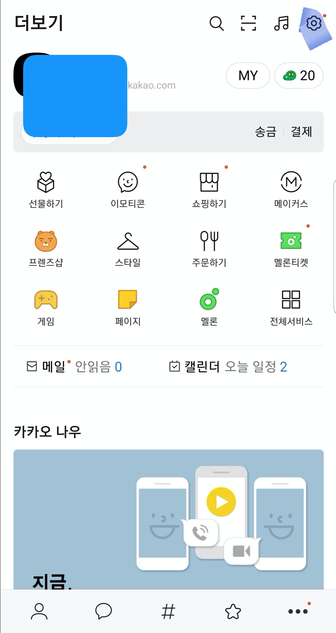 계정 화면에서 우측 상단에 있는 톱니바퀴 버튼을 눌러서 설정 화면으로 들어갑니다.
