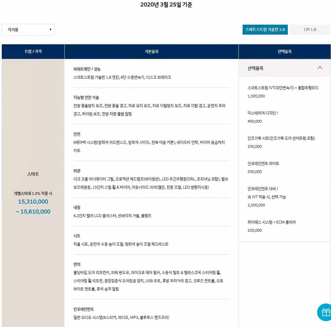 판매가격 : 가솔린 모델 1,531만원 ~ 2,422만원 / LPi 1,809만원 ~ 2,197만원