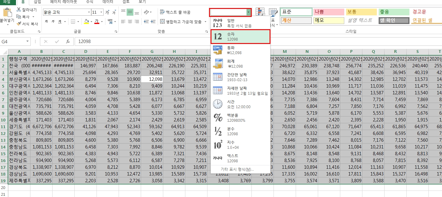 전체를 선택한 다음 홈 메뉴 탭에서 "통화"라고 쓰여있는 데이터 타입을 설정하는 리스트 박스를 열어서 "숫자"로 선택을 합니다.