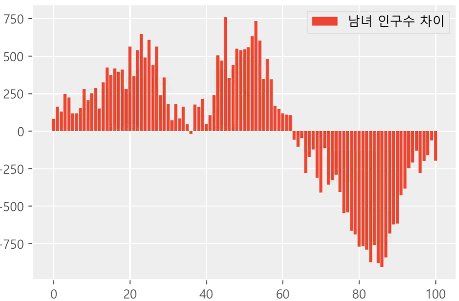 위 데이터는 남자에서 여자 인구수를 각 연령에서 뺀 값입니다.