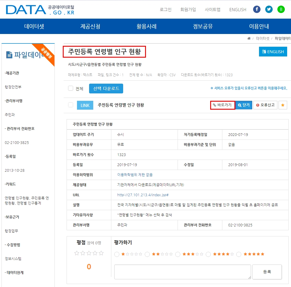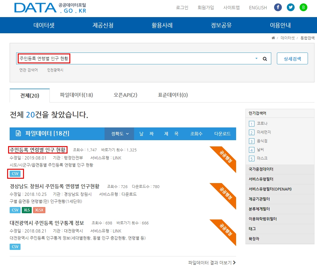 위 그림에서와 같이 "주민등록 연령별 인구 현황"이라고 검색을 하면 가장 위에 행정안전부에서 업로드한 주민등록 연령별 인구 현황 파일 데이터를 확인할 수 있습니다.