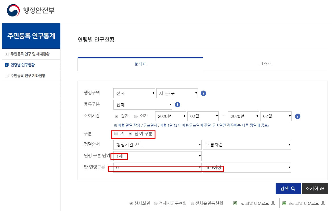 만 연령 구분은 '0'에서 '100 이상'으로 설정하고 "검색" 버튼을 눌러 줍니다.