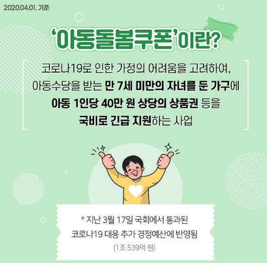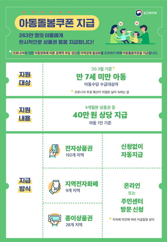 보건복지부는 4월 6일부터 4월 10일까지 대국민 안내기간을 거쳐 13일 부터 전자상품권, 종이상품권, 지역전자화폐 등으로 40만원 상당의 아동돌봄쿠폰을 대상 가구에 지급 한다고 합니다.