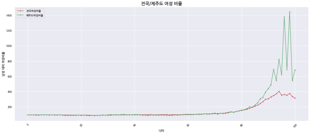 7. 전국, 제주도 남성 대비 여성 성비 데이터를 이용해서 꺾은선그래프로 시각화 하기