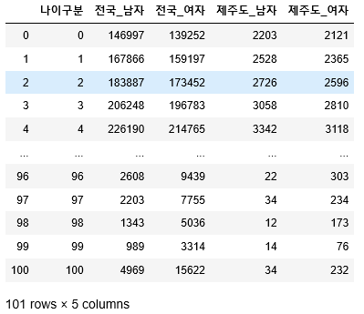 1세 ~ 100세 이상 구간으로 1세 단위로 나뉘어 있는 전국 및 제주도 남녀 인구 데이터를 가지고 옵니다.