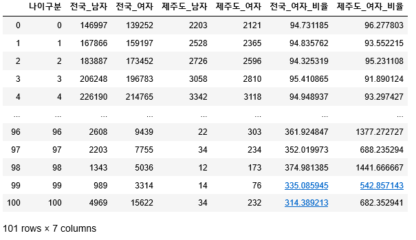 이렇게 봐서는 잘 모르겠으니, 전국 인구와 제주도 인구 남, 녀 인구 데이터를 이용해서 남성 대비 여성 인구 비율을 구해서 데이터 프레임에 칼럼을 추가 하도록 하겠습니다.