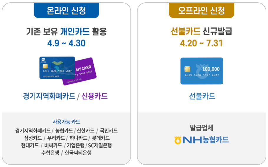 기존에 보유하고 계시는 경기지역화폐 카드 나 신용카드가 있으신 분들은 오늘 (4월 9일) 오후 3시부터 웹에서 신청을 하시면 됩니다!