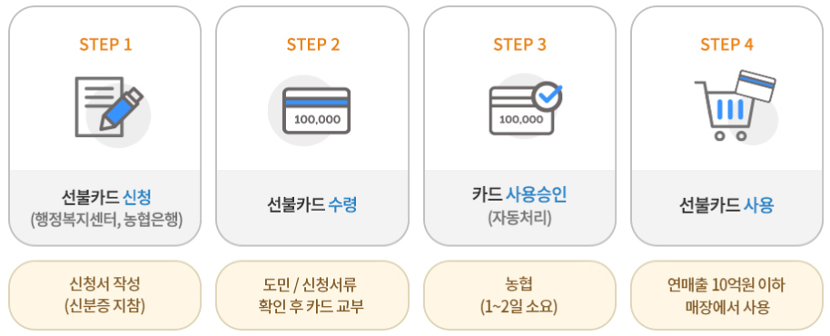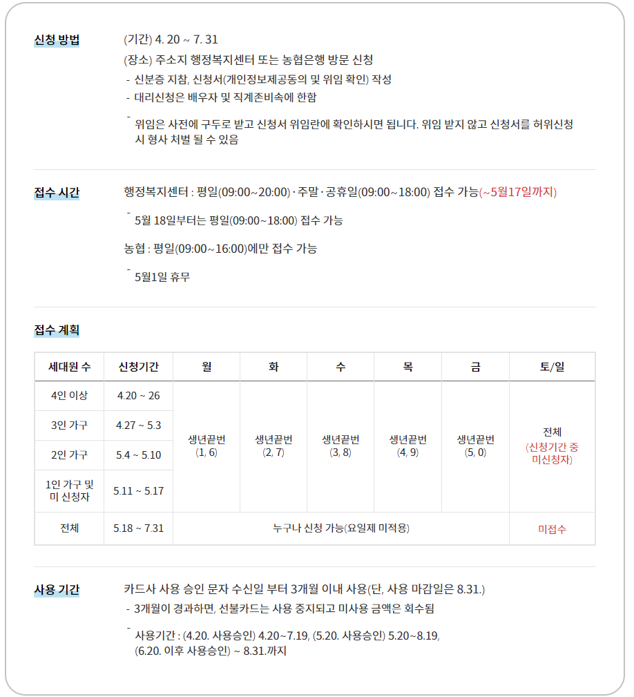 그렇지 않으신 분들은 오프라인에서 신청을 받습니다! (4월 20일 ~ 7월 31일) NH농협에서 오프라인 신청을 통해서 선불카드로 지급될 예정입니다.
