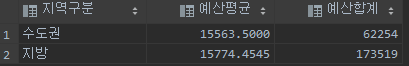 select if(do in ('서울특별시','경기도'), '수도권','지방') as 지역구분 , avg(budget_value) as 예산평균, sum(budget_value) as 예산합계