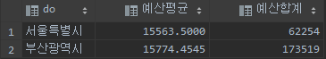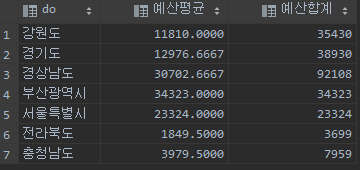 예를 들어 보겠습니다. 위와 같이 예산 평균, 합계를 구하는데, 수도권과 광역시 두 개의 그룹으로 나누어 보려고 합니다. 편의상 do 칼럼 값 중 "서울특별시", "경기도"를 수도권으로 하고 기타 지역들은 지방으로 나누어 두 그룹의 결과를 아래 SQL을 이용해서 출력해보겠습니다.