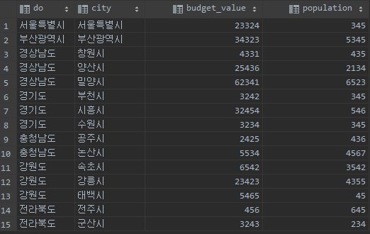 각 시별 예산과 인구수를 가상의 데이터로 넣었습니다. 실제와는 큰 차이가 있겠죠?