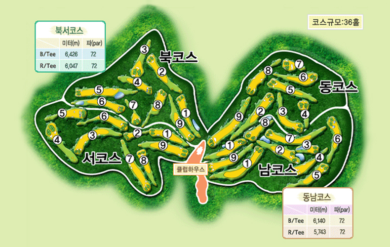코스는 남도, 북서 코스로 이루어져 있으면 총 36홀입니다.