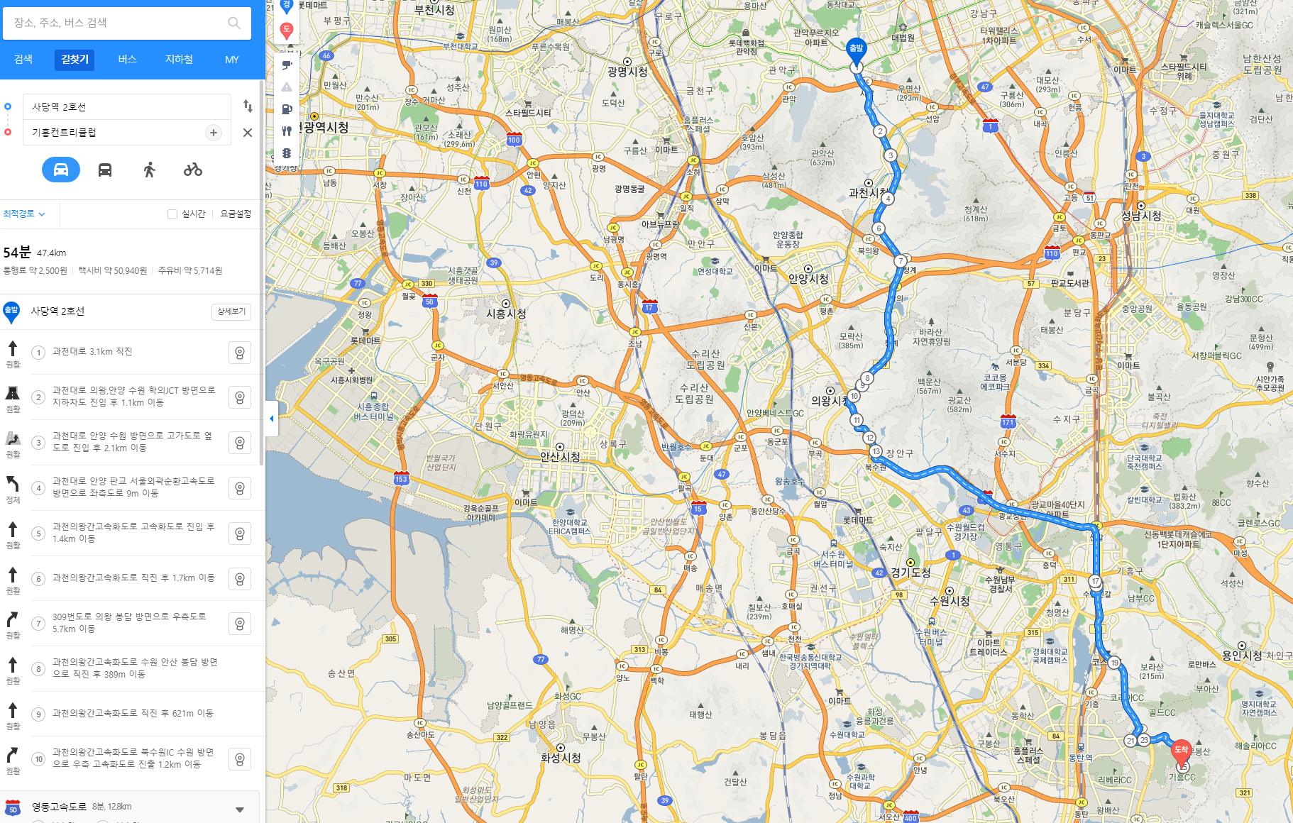 사당역을 기준으로 잡았을 때 기흥 CC까지 약 54분 정도가 소요된다고 나옵니다.