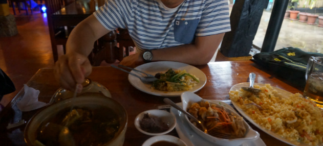 식당에서 필리핀 족발 튀김 음식인 크리스피 빠따 와 같이 생긴 악어 고기 요리와 해산물 볶음밥, 제가 정말 좋아하는 필리핀 음식 중 하나인 카레카레를 주문했습니다.