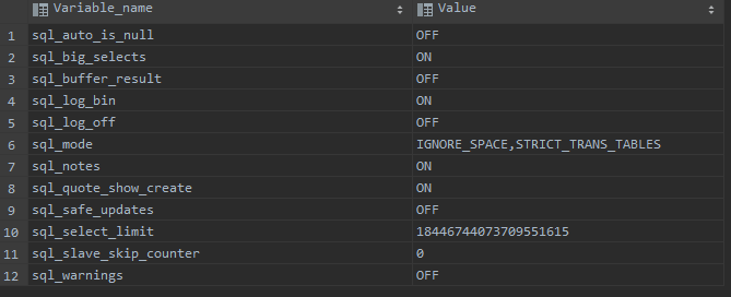 SHOW VARIABLES LIKE 'sql_%';