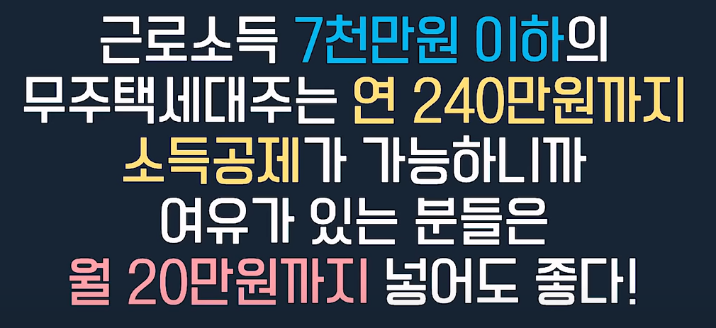 연 7천만 원 이하의 근로소득을 가지는 사람이 무주택 세대주일 경우 청약통장에 연 240만 원까지 소득공제가 가능합니다. 여유가 있으신 분들은 월 20만 원씩 넣으면 유리합니다.