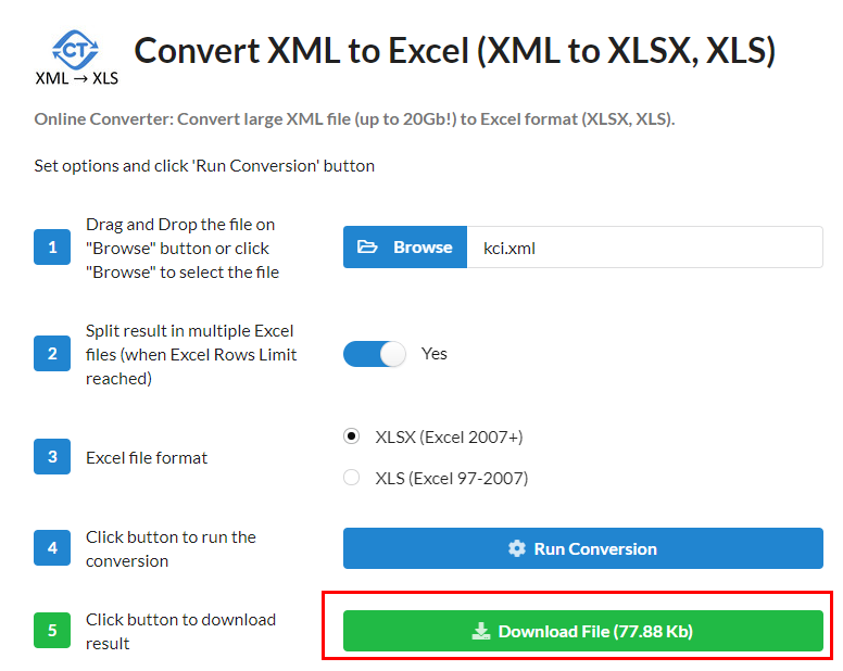 프로그래스 바가 올라가면서 100%가 되고 나면 Download File 버튼을 눌러서 xml에서 excel 파일로 변환된 파일을 다운로드하시면 됩니다.