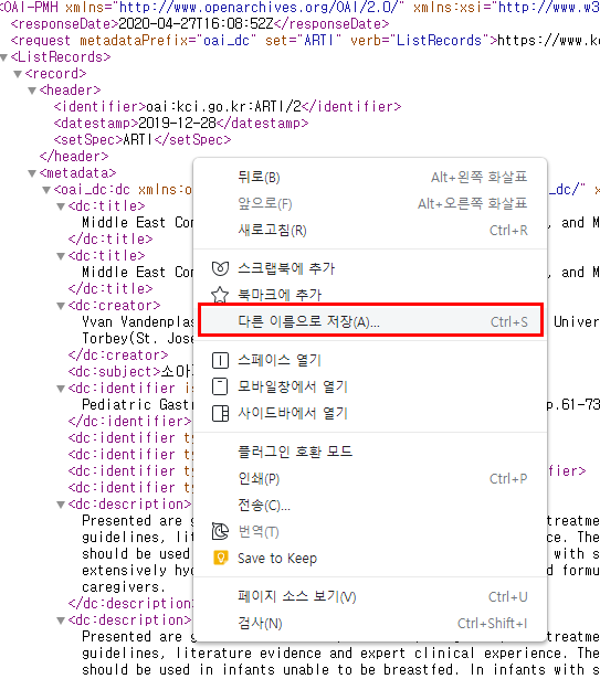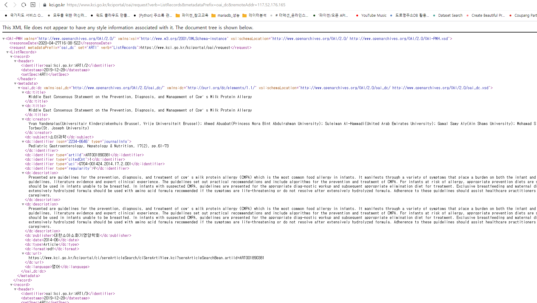 우선 OAI-PMH 프로토콜을 통해서 값을 한번 테스트 삼아서 받아와 봤습니다.