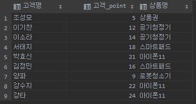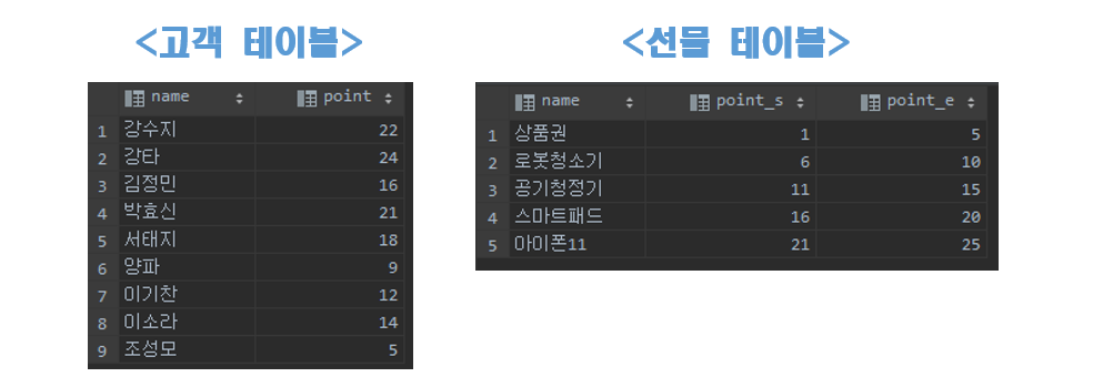 데이터를 보시면 만약 이기찬이라는 고객은 포인트를 12포인트 가지고 있으니, 선물 테이블에서 11포인트 ~ 15포인트 사이인 로봇청소기를 사은품으로 가져갈 수 있을 겁니다.