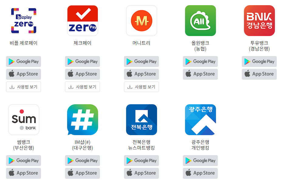 비플 제로 페이, 체크 페이, 머니트리, 농협 올원 뱅크, 경남은행 투유 뱅크, 부산은행 썸 뱅크, 대구은행 IM샵, 광주은행 개인뱅킹, 전북은행 뉴스마트 뱅킹