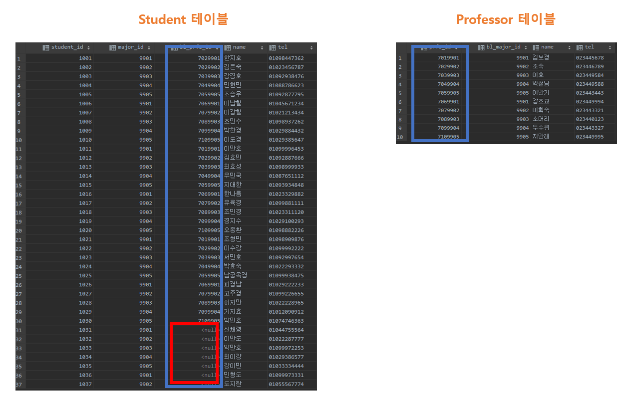 아래와 같이 student, professor 테이블이 각각 있을 때 그림에서 보면 student 테이블에 파란색 박스로 표시된 칼럼이 담당 교수 ID인데, 일부 담당 교수 ID가 없는 학생이 빨간 박스로 표시되어 있습니다.