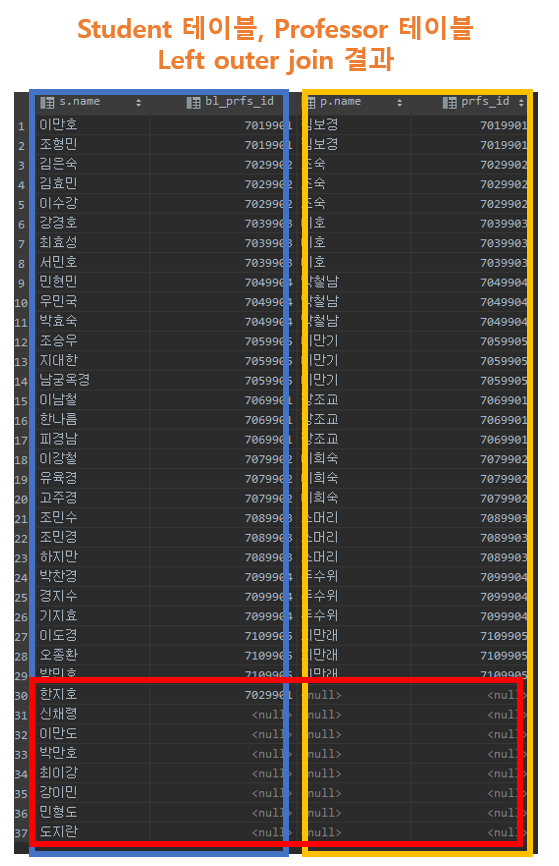 파란색 상자 안의 두 칼럼은 student 테이블에서, 노란 상자 안의 두 컬럼은 professor 테이블에서 가지고 온 데이터를 student 테이블의 bl_prfs_id와 professor 테이블의 prfs_id 두 칼럼을 키로 연결하여 left outer join을 한 건데,