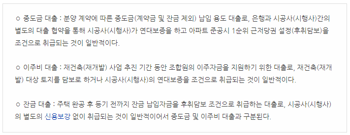 일반적으로 재건축, 재개발 아파트 혹은 신규 분양 아파트를 대상으로 중도금, 이주비, 잔금 대출 등으로 구분되어집니다.