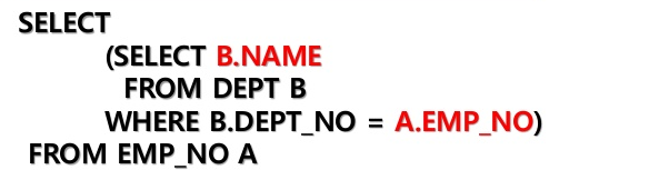 select로 시작하고, 다시 "(" 괄호를 열어서 select 절이 들어가게 됩니다. 이 괄호 안에 select...로 시작하는 SQL을 스칼라 서브 쿼리라고 부르는데, 스칼라 서브 쿼리의 where절에 메인 쿼리의 칼럼 값이 들어가게 됩니다. 그리고 그 값으로 스칼라 서브 쿼리에서 검색된 값이 출력 값으로 나오게 되는 것입니다.