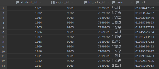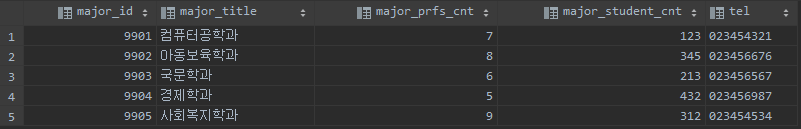 대충 봐도 아시겠죠? 서브 쿼리에서 하나의 행보다 많은 결과가 리턴되었다고 오류가 뜹니다. 학생 테이블에는 특정 major_id를 조건절로 넣으면 하나 이상의 행이 리턴되는 것 이죠.