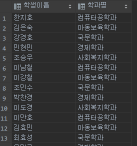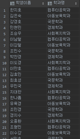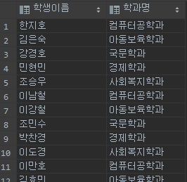 예를 들어보겠습니다. 아래와 같이 학생 테이블과 학과 테이블을 조회하겠습니다.