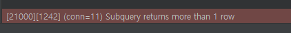 위와 같이 스칼라 서브 쿼리를 사용한 SQL을 작성해서 실행을 하면 아래와 같이 에러가 뜹니다.