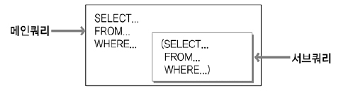 이 서브 쿼리를 메인 쿼리의 select 절에 사용하느냐, from 절에 사용하느냐, where절에 사용하느냐에 따라서 서브 쿼리도 종류가 구분됩니다.