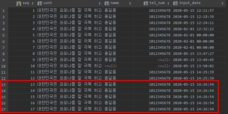 values (13, '대한민국은 코로나를 잘 극복 하고 있습니다.', '홍길동', 01012345678, now()),