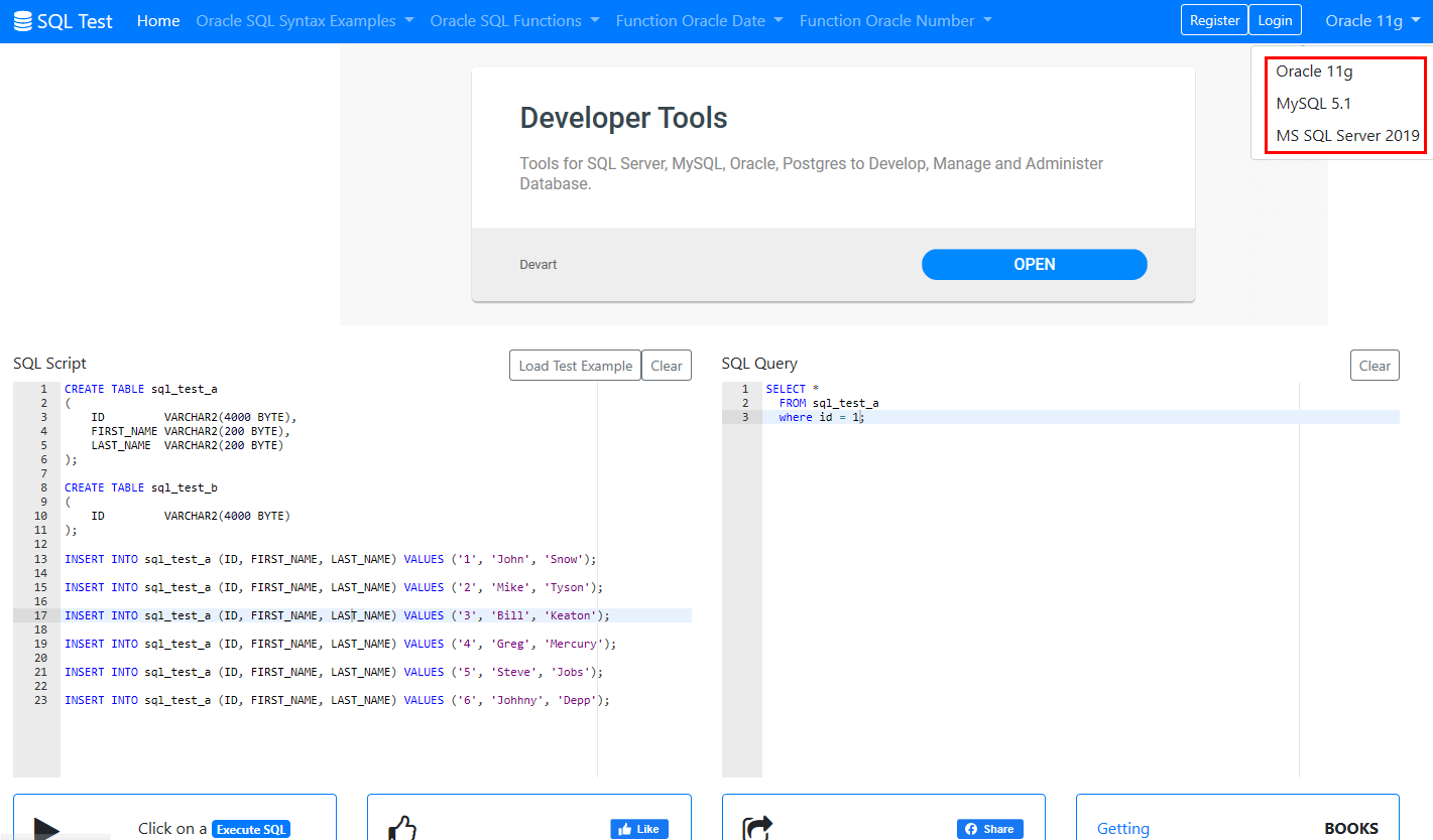그림에서 처럼 Oracle 11g, MySQL 5.1, MS SQL Server 2019 버전으로 각각 선택을 우선 하시고 나서 테스트를 진행할 수 있습니다.