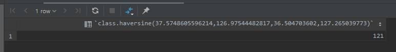 select class.haversine(37.5748605596214,126.97544482817,36.504703602,127.265039773);