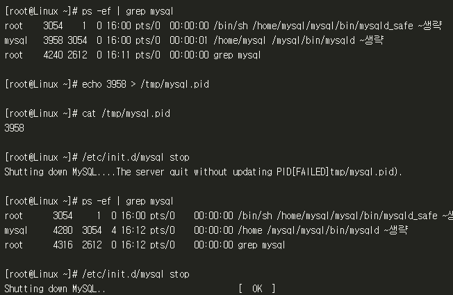 위와 같이 "echo15000>/tmp/mysql.pid" 명령을 이용해서 mysql.pid 파일을 강제 생성하면 됩니다.