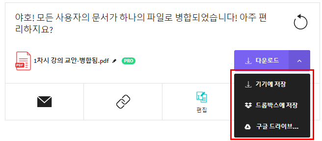 PDF 파일 병합이 완료되고 나면 아래와 같이 세 가지 옵션 중 하나로 결과물을 가져올 수 있습니다.