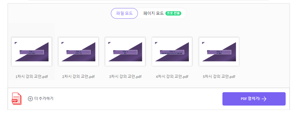 두 번째 옵션은 각 PDF의 페이지별로 한 장씩 선택하거나 해서 병합을 할 수 있습니다.