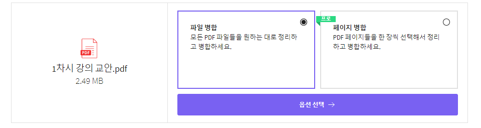 파일 병합을 선택하고, 아래에 있는 옵션 선택 버튼을 눌러줍니다.