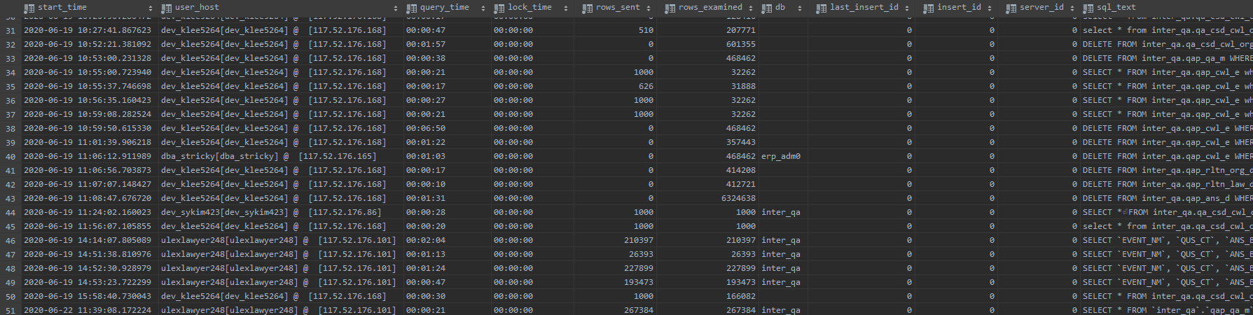 SQL 실행 시간, host 및 user 정보, 상세 SQL이 저장되어 있어 필요한 데이터를 select 하여 확인할 수 있습니다.