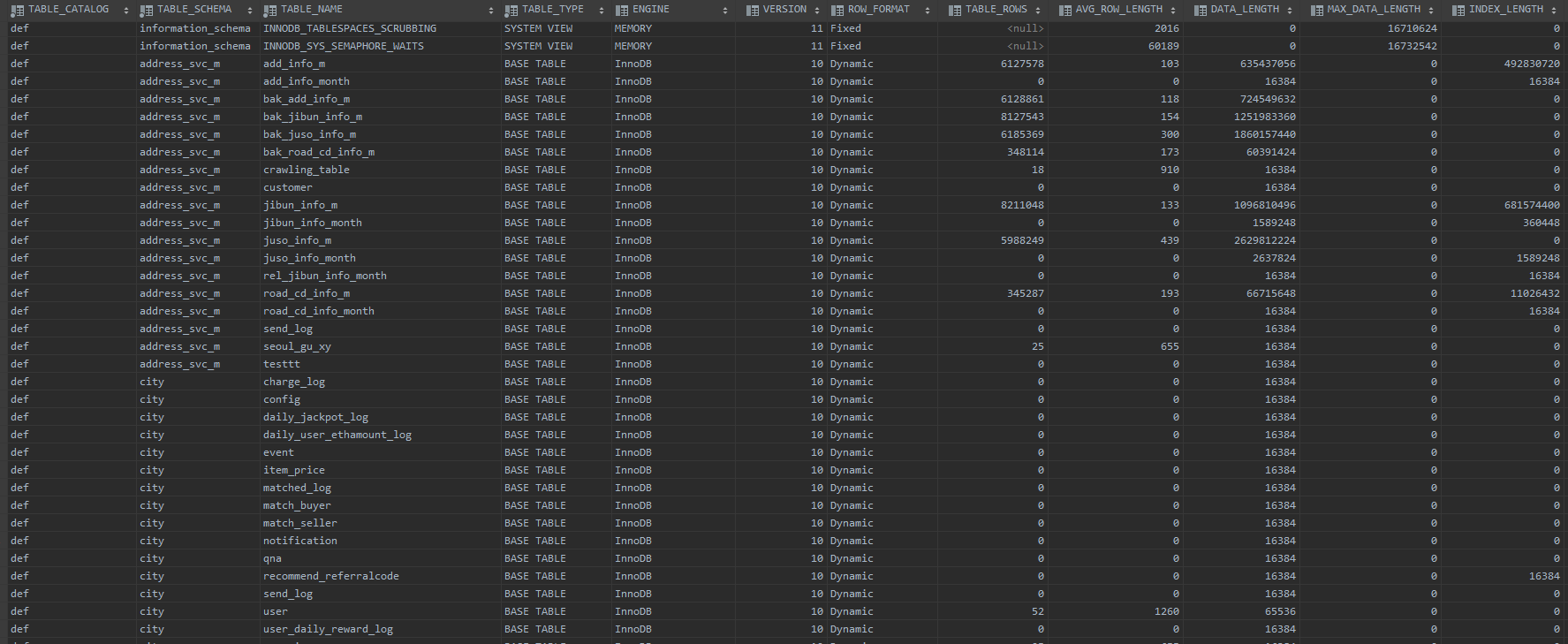 생성일자, 수정 일자, 테이블 로우수, 테이블 코멘트, 테이블 스토리지 엔진 타입 등의 정보를 한눈에 확인 가능합니다.