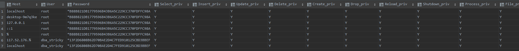 user명과 함께 host(접속지) 정보, 그리고 password가 암호화되어 저장되어 있습니다.