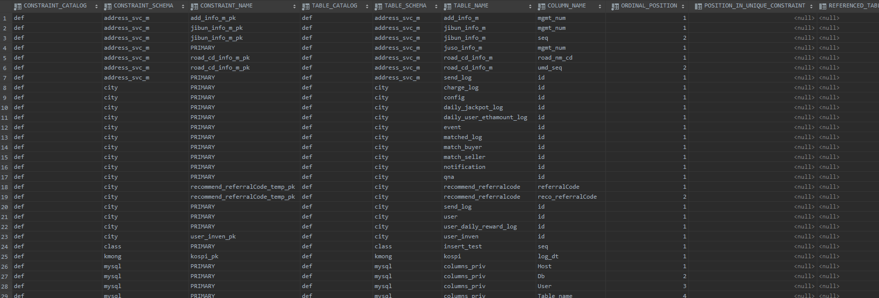 MySQL 내부에 생성된 테이블별 PK칼럼 또는 unique 제약조건들의 목록을 확인할 수 있습니다.