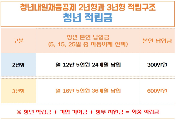 청년 적립금의 경우 본인 납입금을 이야기하는 건데, 2년형의 경우 3백만 원, 3년형의 경우 6백만 원을 납입하게 됩니다.