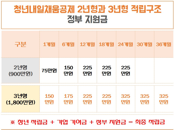 청년 내일 채움 공제의 2년형과 3년형의 차이점은 본인 납입금과 함께 기업 기여금, 그리고 정부 지원금에서 차이가 생깁니다.