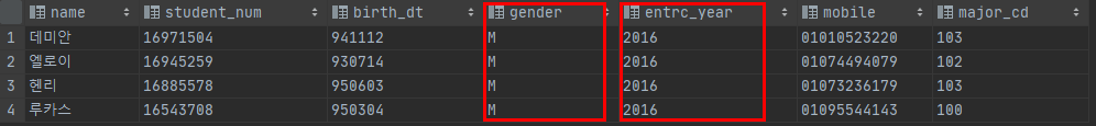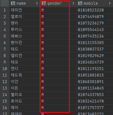 select 절에 name, gender, mobile을 넣었더니 위 그림처럼 기입한 3개의 컬럼만 출력이 됩니다.