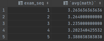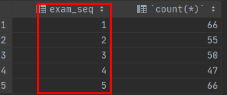 위 결과를 보면 class.exam_result 테이블에는 exam_seq값이 총 1~5까지 있습니다.