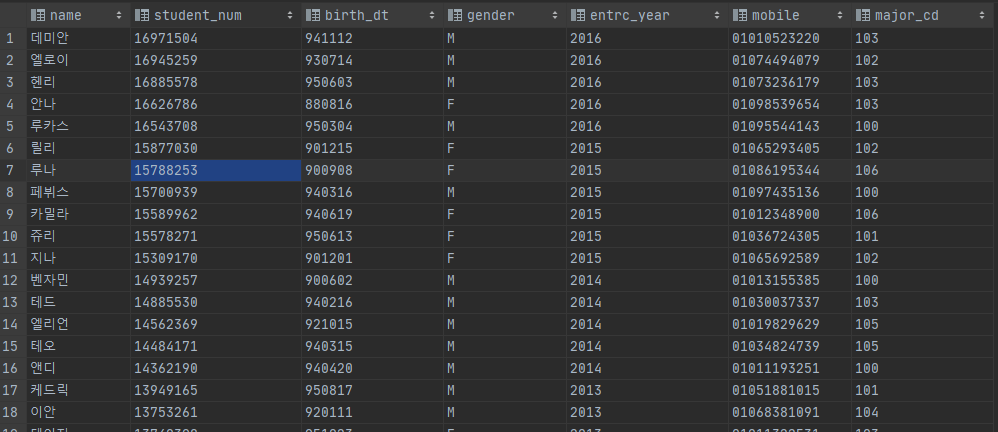 아래와 같이 student 테이블 내 모든 칼럼과 row가 출력됩니다.